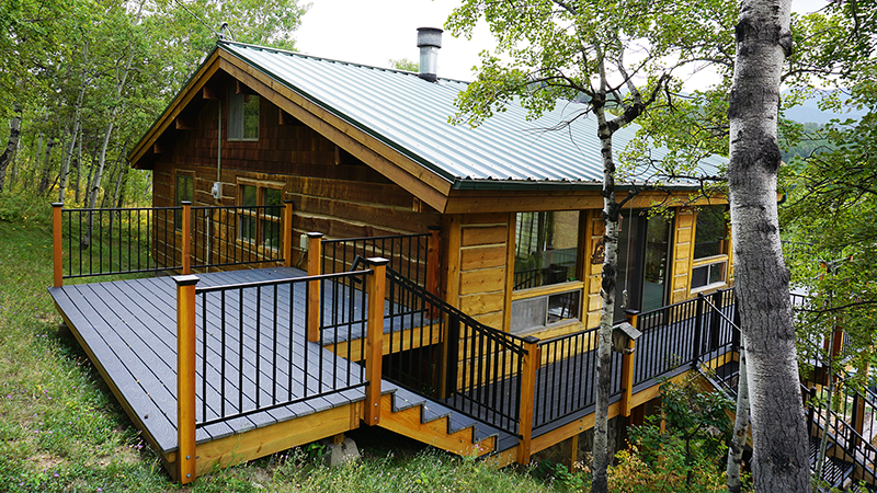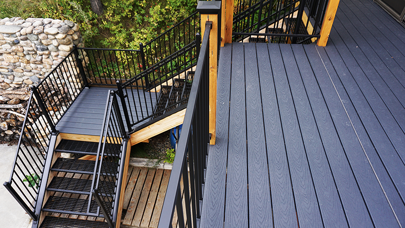 Multi-level, wrap-around deck featuring metal railing, stair treads and accents, and dark composite decking to create the perfect outdoor space for a home nestled in the aspens.